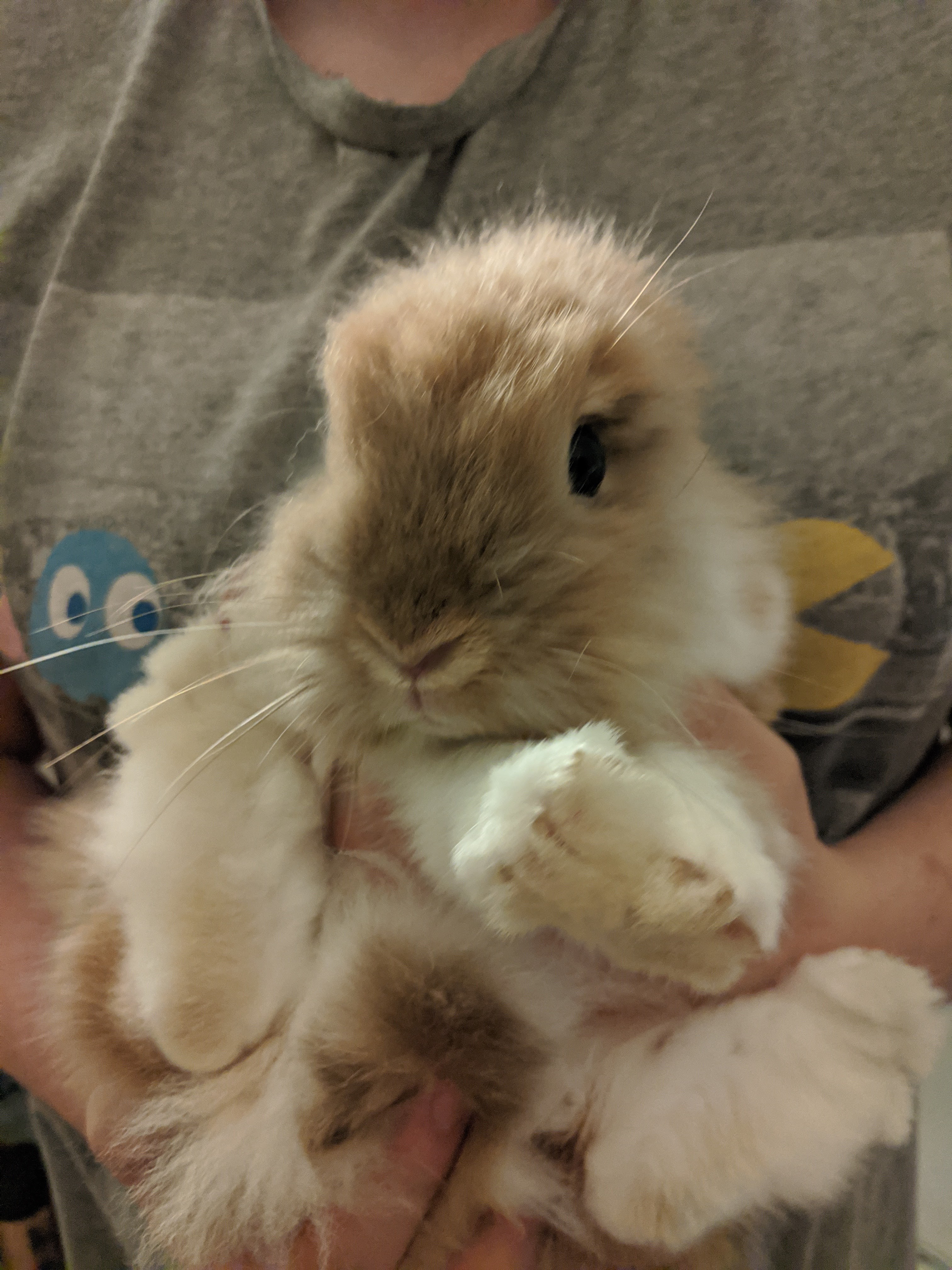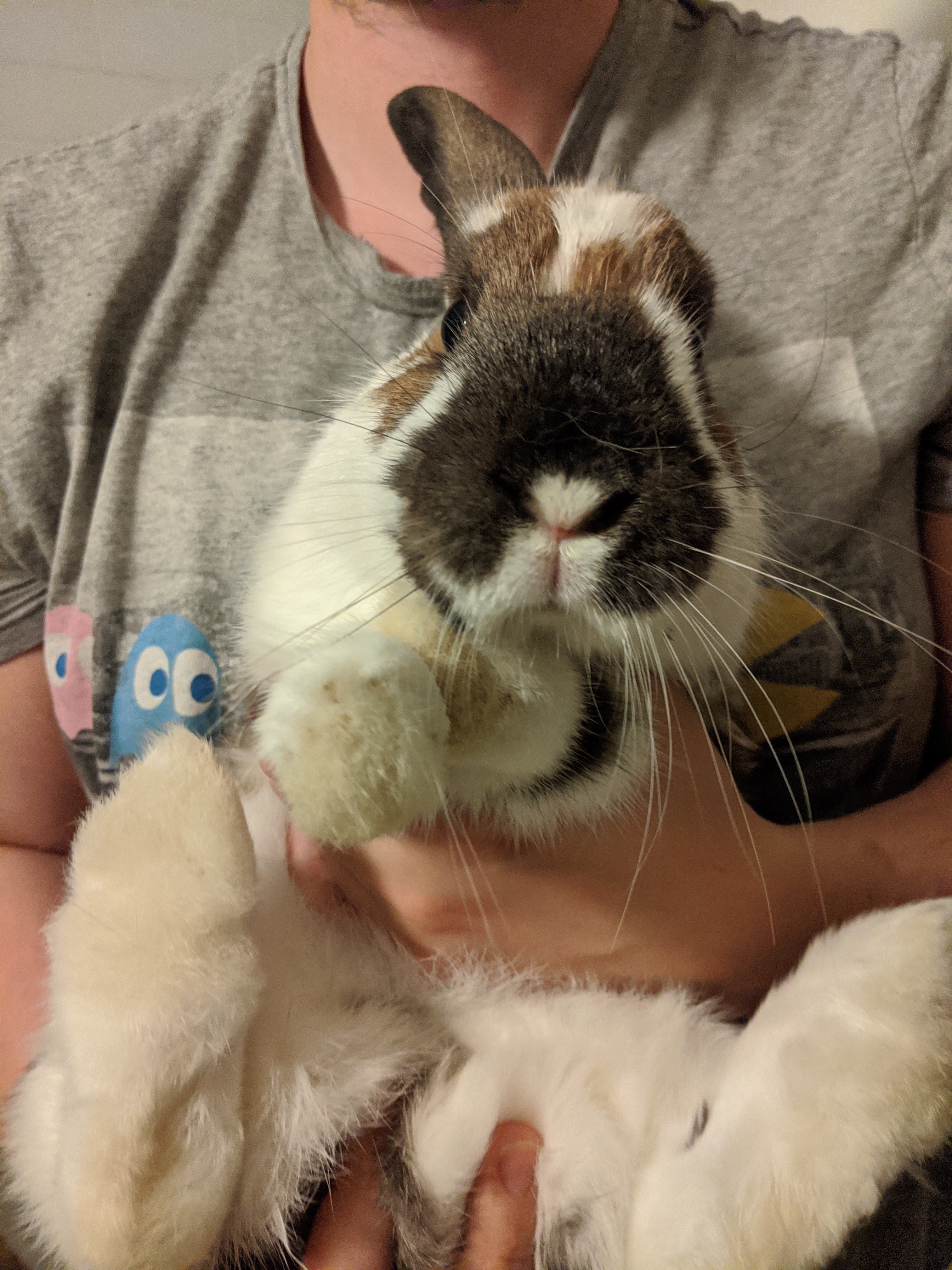 When picking up our bunnies (purely to move them from bathtub to pen) this is how we have to carry them to ensure they can’t wriggle out of our grasp. They look so cute, I just couldn’t resist a little picture. As you can see…Lola (top) and Sasha (Bottom) hate us for it.