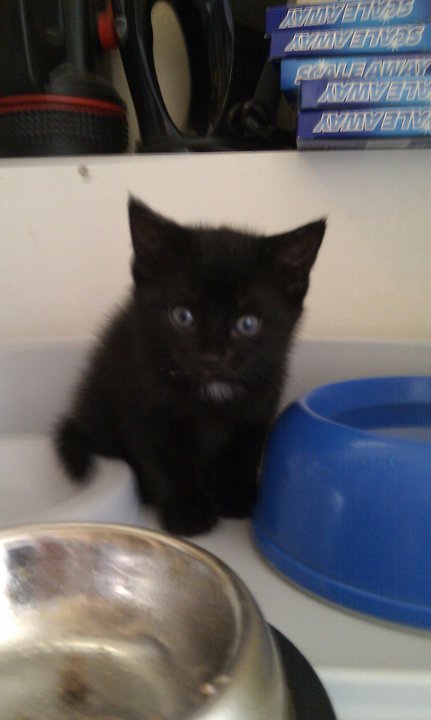 This is Jinx. This was a photo of her when we first brought her home, nearly 10 years ago. She was the runt of the litter and to this day is still pretty small for a cat. But this was her, next to her water bowl and food bowl. And she could easily have curled up in both of them quite happily.