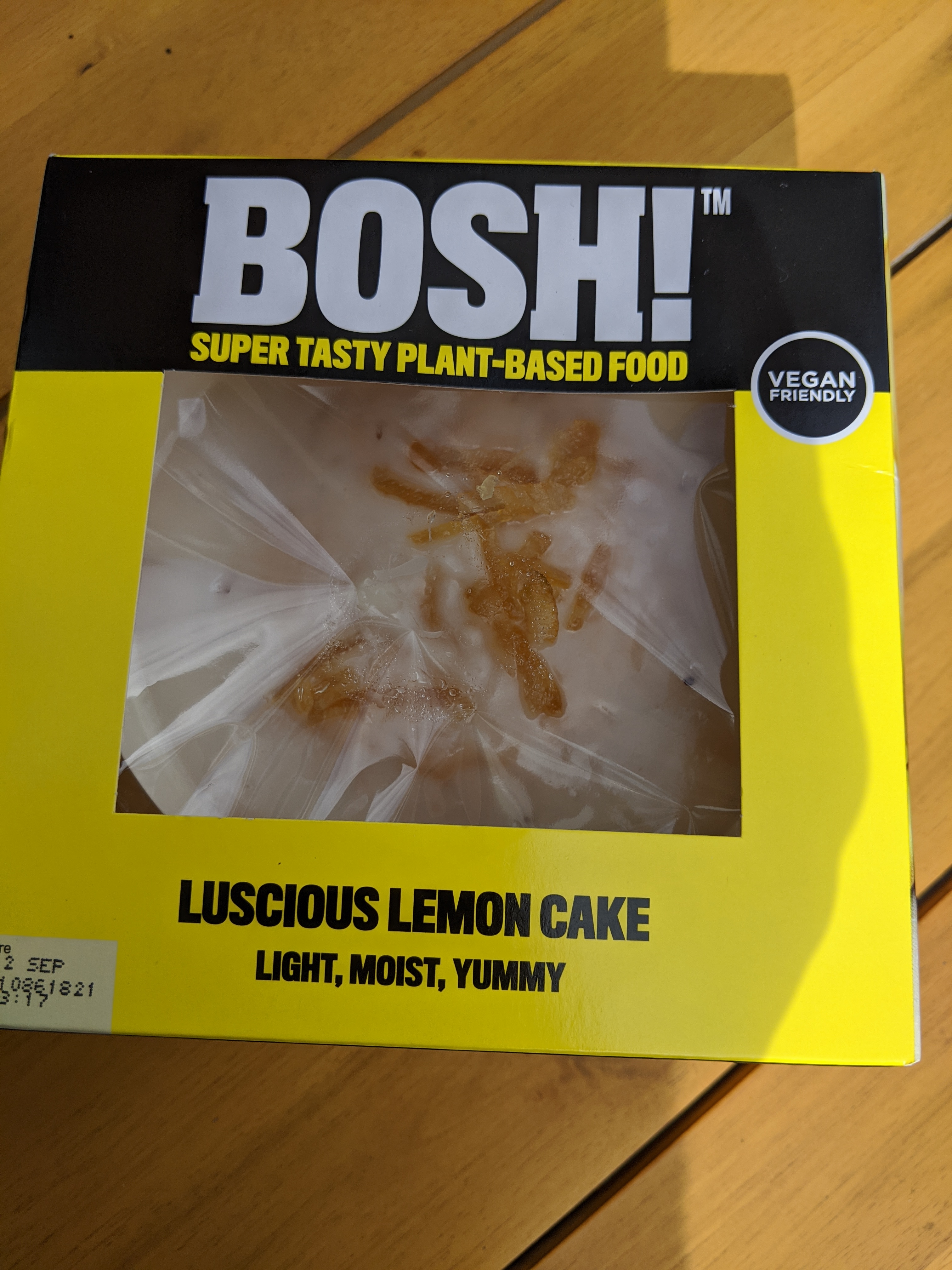 This weekend was one of birthday celebrations for a family member, so what better excuse for cake than a birthday?! On offer was a chocolate cake and a lemon drizzle. They are kind of expensive, at £3.50 each, which is kind of steep bearing in mind the cakes are about the size of a side dish. But that being said, these BOSH! cakes are some of the very few – if not the only – vegan ready made cake that I have found on sale at a supermarket. Usually if I want a vegan cake I have to either make it myself or order a specially made one from a bakery….or just have a cupcake.