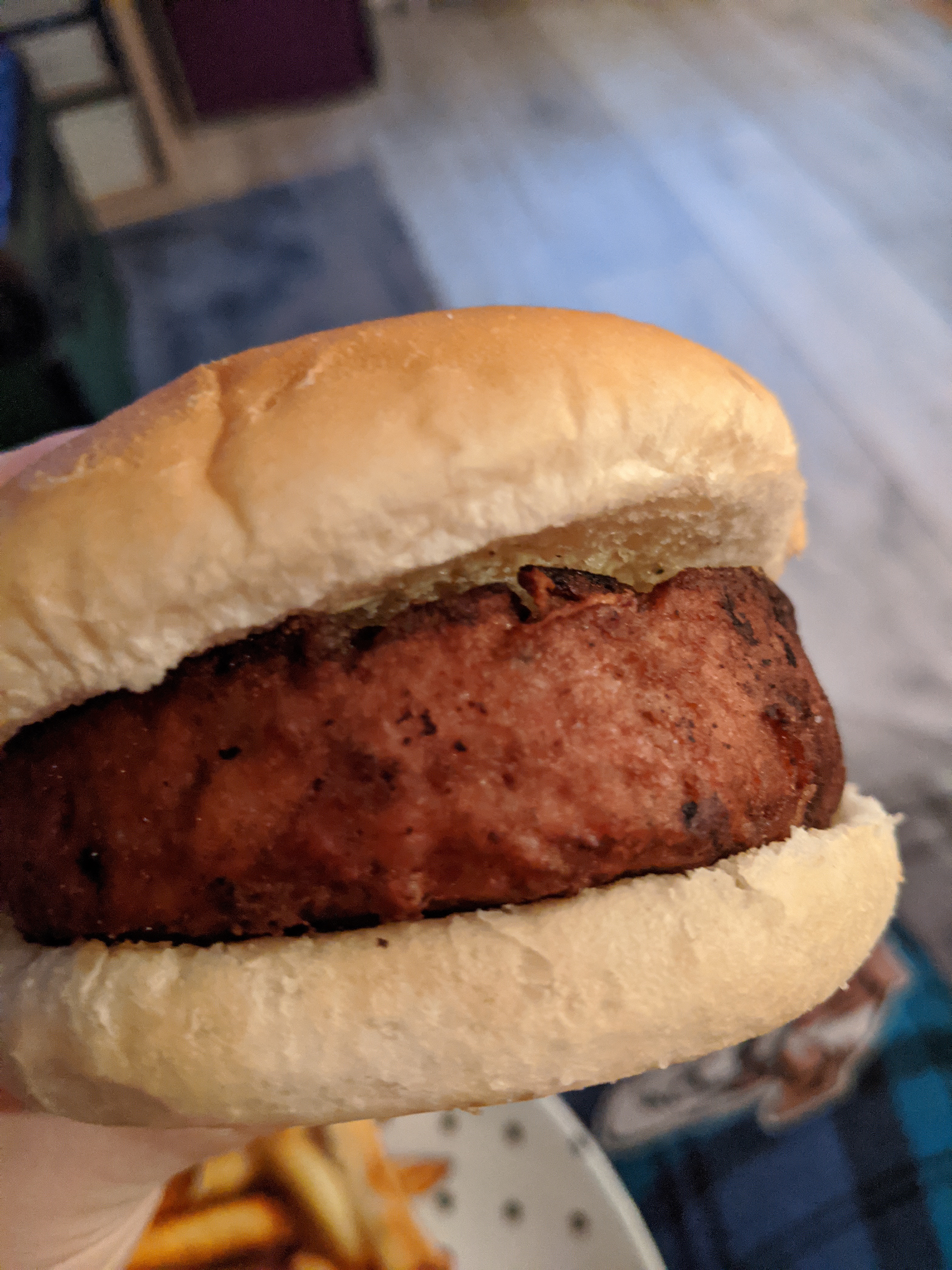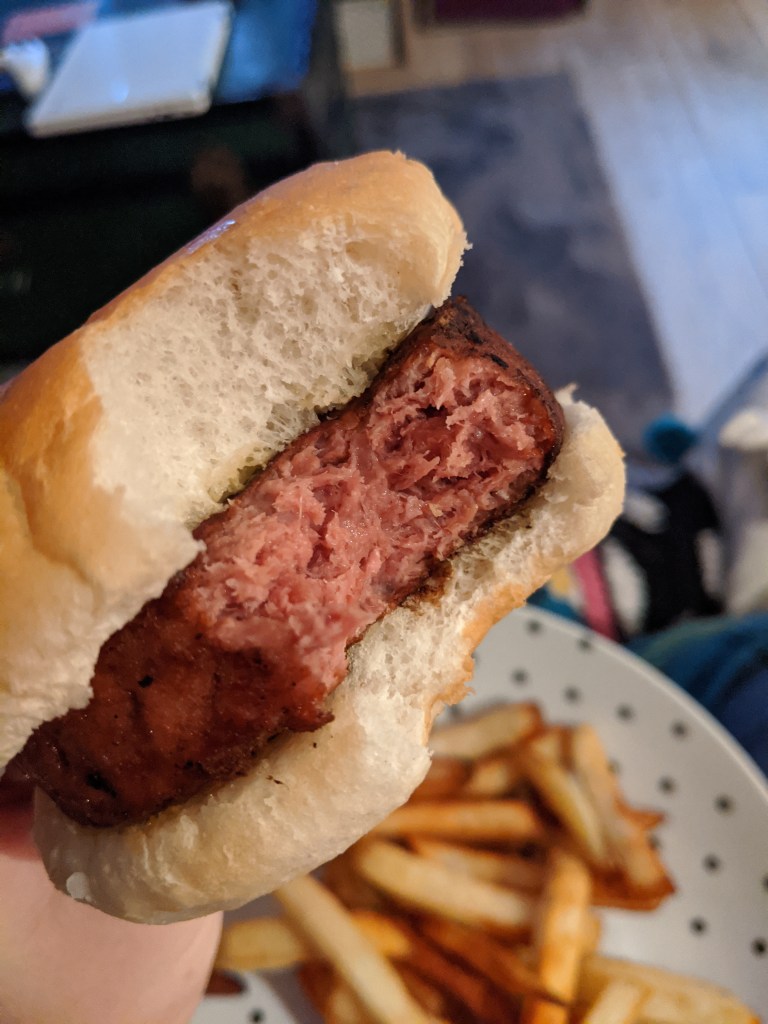 Unfortunately these were kind of disappointing. They taste nice…they taste like burgers. But the texture is just…odd. They have that frozen texture. The outer edges were nice because they crisped up the most and had that very nice burger texture to them. But the further you got into the centre of the burger the more wet and flaky it got. But not in a good juicy kind of way. Just in a bad ‘this is like a wet book’ type way.