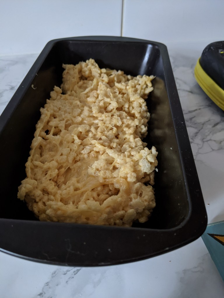 - Spread the mixture into a tray and flatten as best you can. We used a bread tin because we wanted pretty thick squares, but you can use whatever size and shape you want your treats to be.