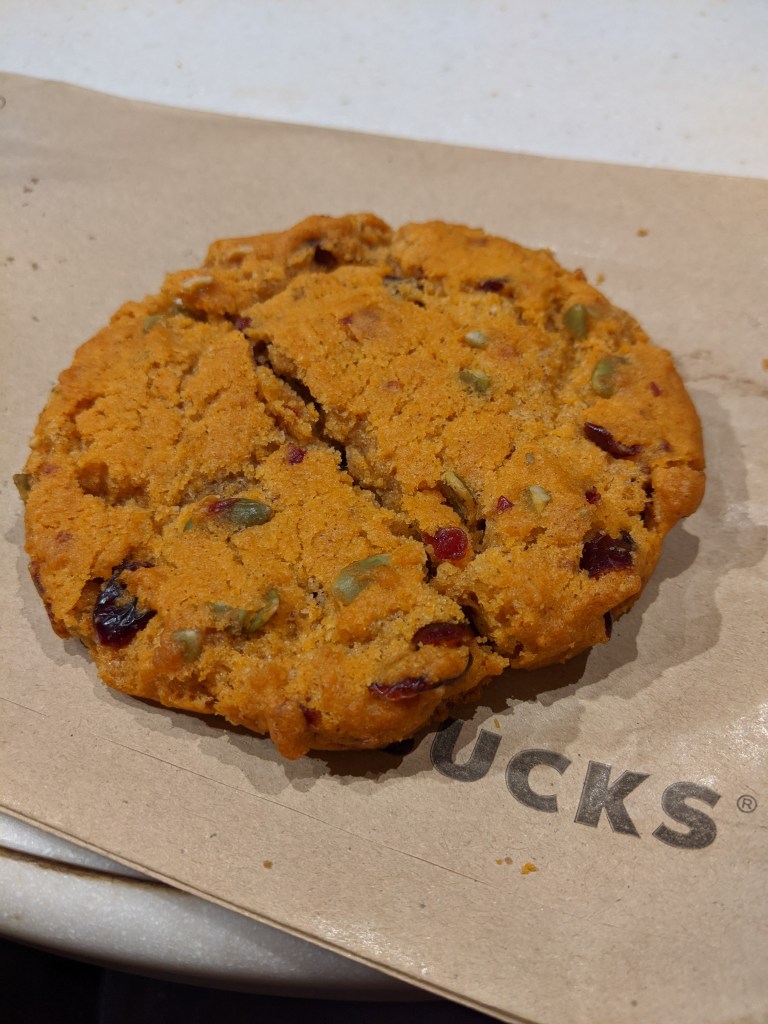 This year Starbucks have also released a vegan pumpkin cookie. It’s really good! It is sweet, as you would expect a cookie to be, but the pumpkin flavouring means that it is not overly sickly sweet as most cookies can sometimes become. It is a nice savoury/sweet mix and goes really well with a latte – pumpkin spice or other!
