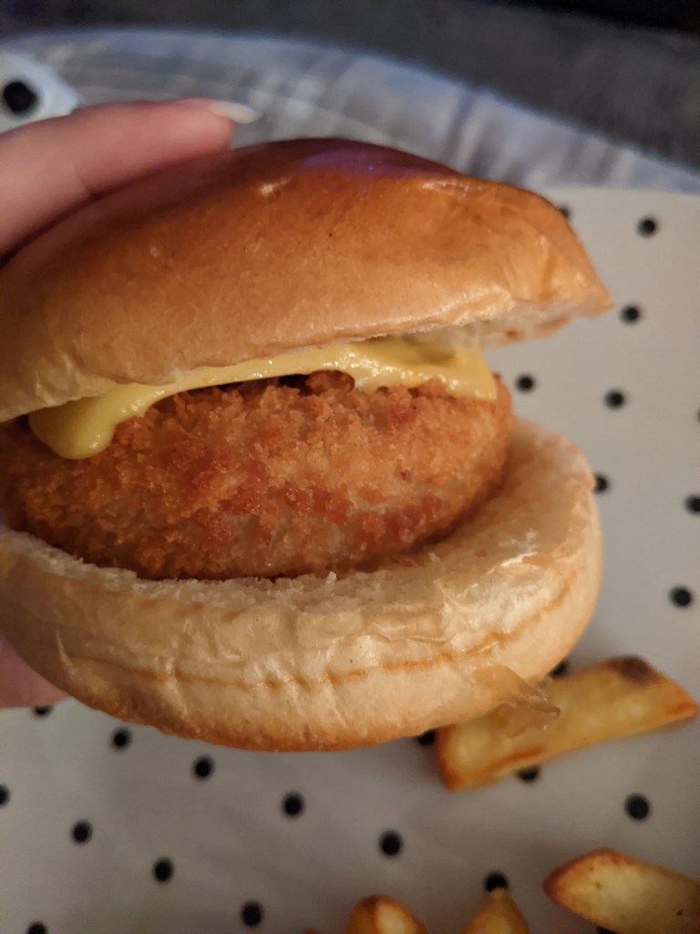 We also tried these chicken burgers and they were…ok? I never really understood the allure of chicken burgers anyway (ignoring the whole, having to kill a chicken side of it anyway), but I know that they are meant to be healthier than the beef/red meat varieties that you could buy. But we saw this and as it is a new vegan option that we haven’t tried before, we gave it a go!