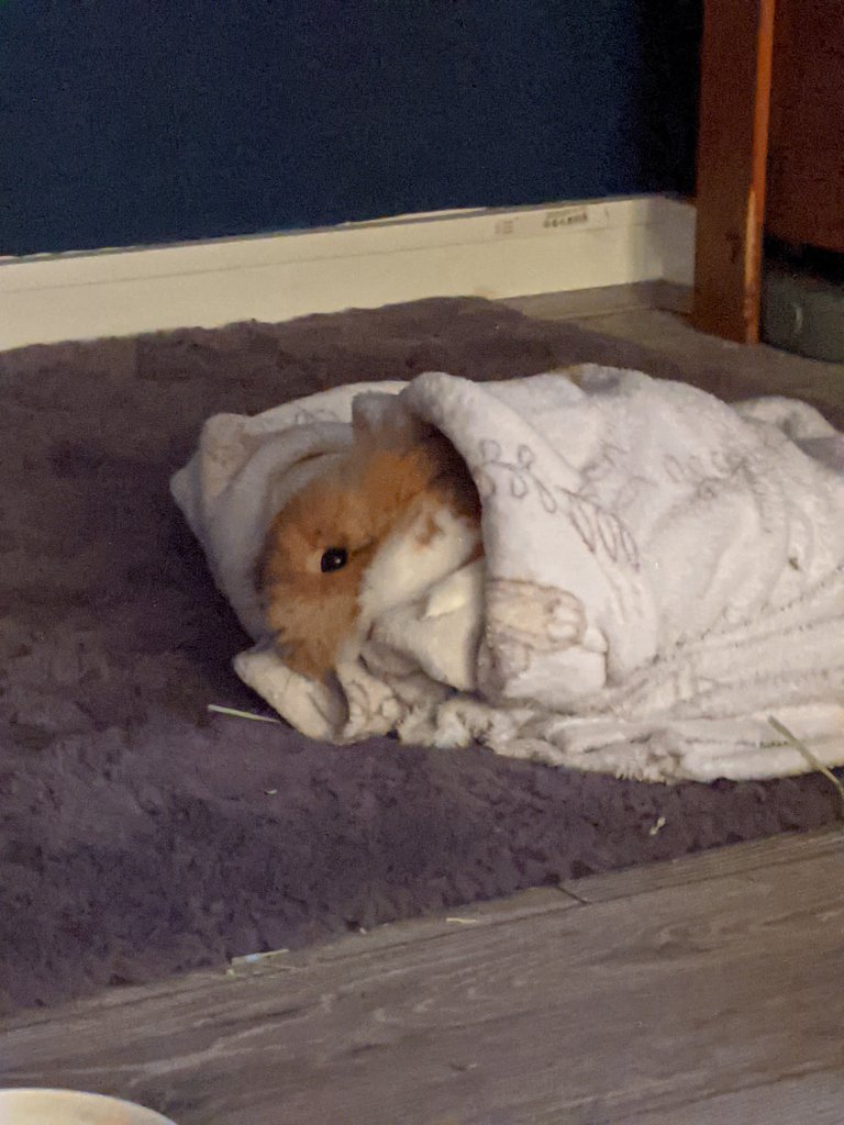 Lola loves to snuggle down on our fluffy rug and is happy to sit there for hours. I decided to test my luck and wrap one of our blankets around her to tuck her in and make her super snug. It is getting very cold here in England so I always worry that they aren’t warm enough even with the heating on.