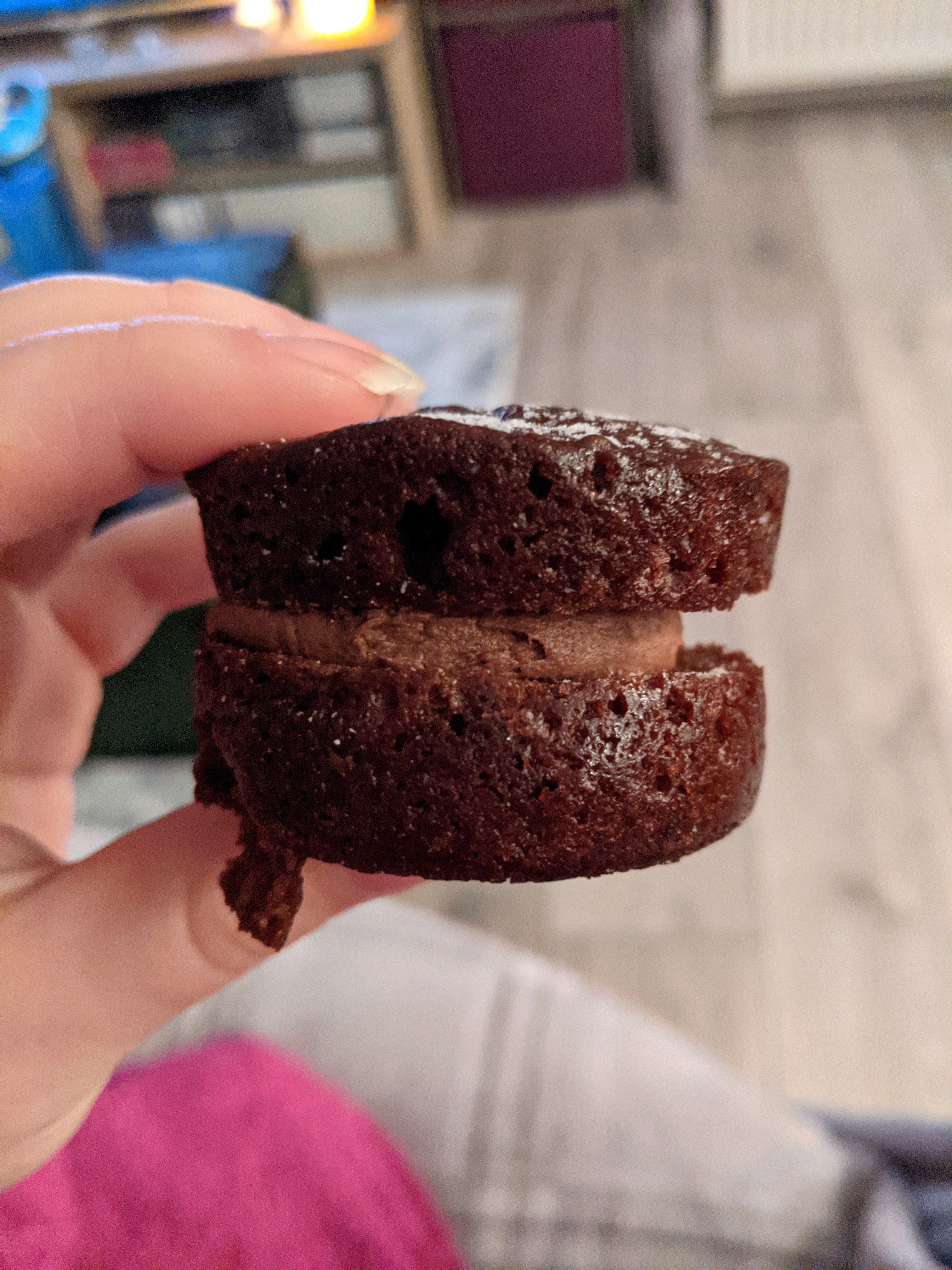 They are very yummy though. Definitely can taste the fudge in them and they are very chocolatey. Almost to the point where they can get very rich and very sickly very quickly. Luckily, they do seem to keep really well: I can have a packet for a week and they are still soft and spongy by the fifth day after being opened. Granted I keep them in a tupperware, but they definitely do not seem to lose any of their moisture.