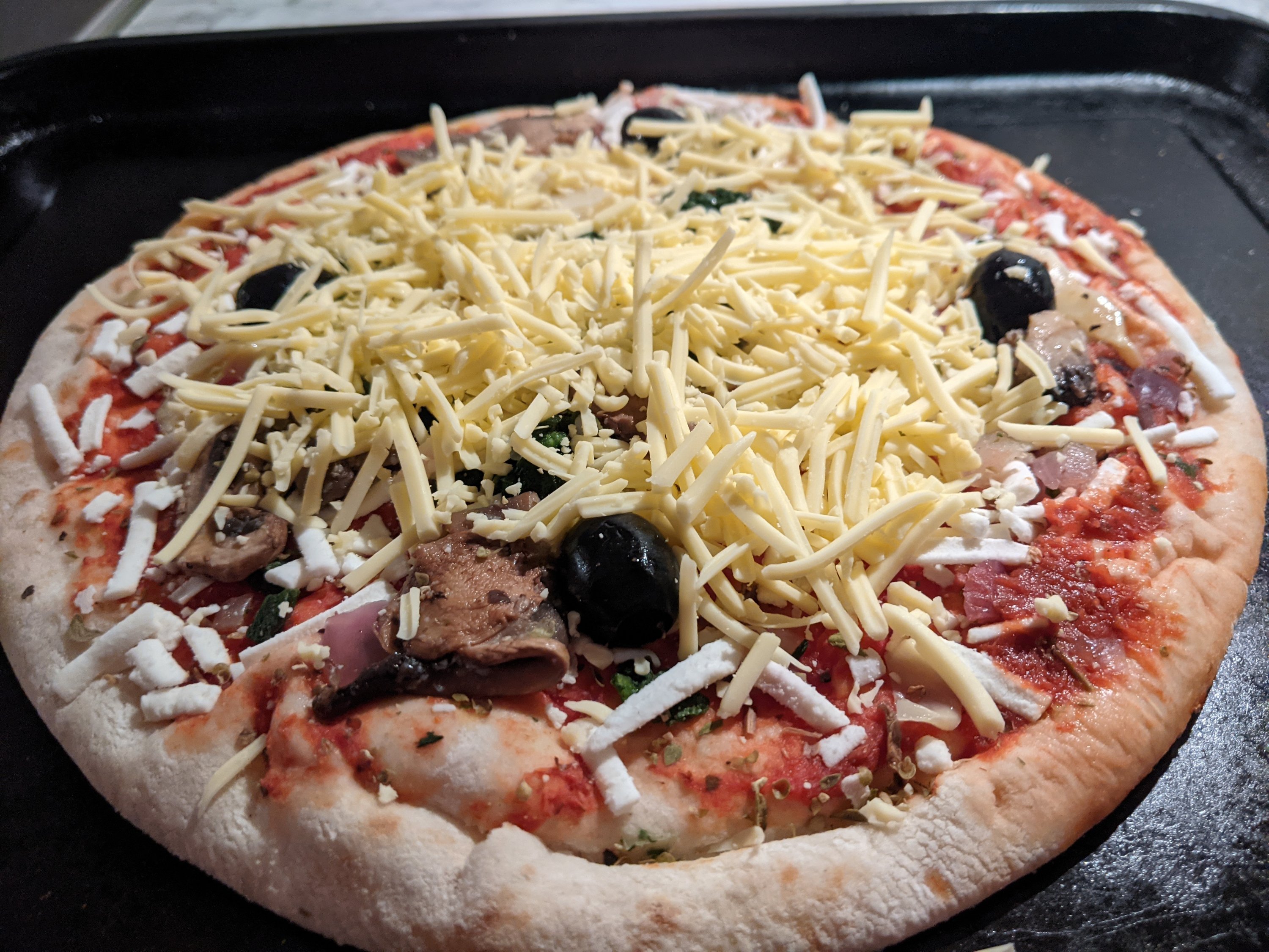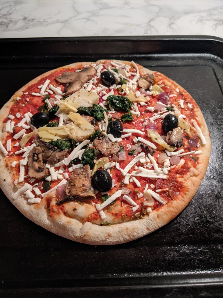 The only downside is that, as with most pizzas, it is very light on the cheese. As in…there was barely any. I think people are under some false assumption that we vegans are not as in love with vegan cheese as dairy cheese lovers are. Trust me….we are! I thankfully had a bit of left over grated cheese from another meal so I added a ‘small’ handful to it. It really did amplify this pizza so I don’t know why they always scrimp on the cheese.