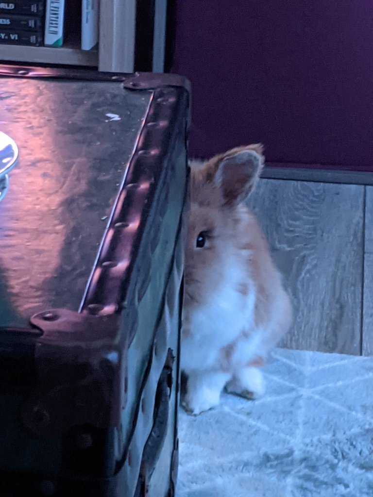 We were slightly late having our own dinner, which meant we were slightly late in giving Lola her bowl of greens. This is what we saw, peeking around our coffee table, at the time when she usually has her greens, reminding us that we were – in fact – super late to feed her and that she would shortly starve to death unless we feed her IMMEDIATELY.
