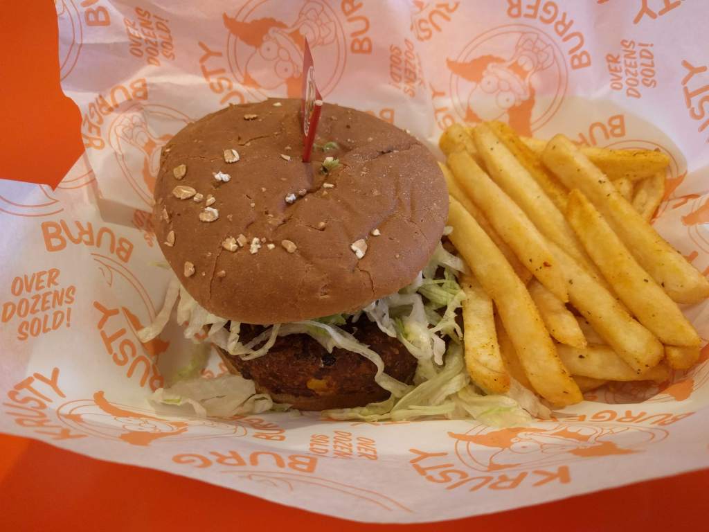 I was very excited though to actually go to Krusty burger. We had packed some snacks for the day just incase they didn’t have any options, and was quite surprised that Krusty Burger had a vegan option. I will admit I did not have high hopes: I thought it would be your standrad fast food type burger.