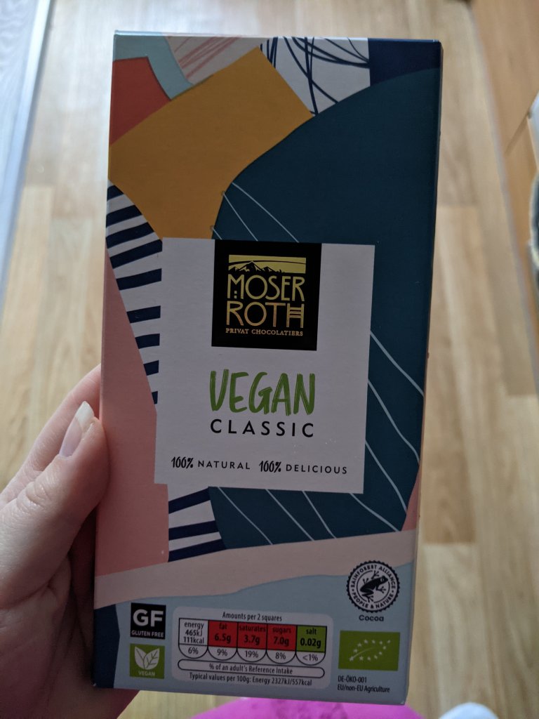 I have never heard of Moser Roth, but they had quite the selection (I saw selection – there were 3 options that I saw, but that’s still a fair amount compared to some other brands) so I thought I would try them. They also state that the brand is rain forest certified cocoa and fair trade, so it also makes me happy to think that I am supporting a brand that is actively trying to do good.
