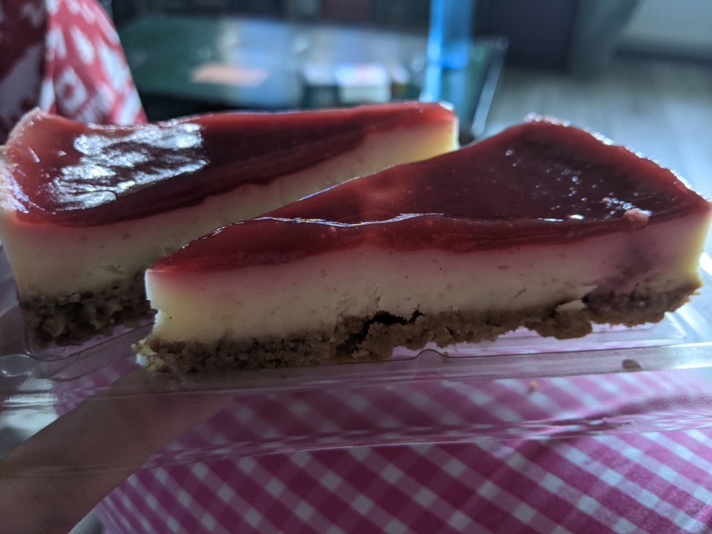 This cheesecake was good but nothing too special. It was definitely creamy and soft, which is just what you want from a cheesecake, but it didn’t really taste of much. You got a real kick of strawberry on first bite, but it disappeared really quickly and you were left with just a bit of a…milky? creamy? That kind of taste. It was also quite dry, in the sense that it needed a cup of tea to go with it. You know when you put peanut butter on the roof of a dog’s mouth and they sit there trying to get it off, and it can be quite cute and funny to watch? That was me about three bites into this, except I know it didn’t look cute.