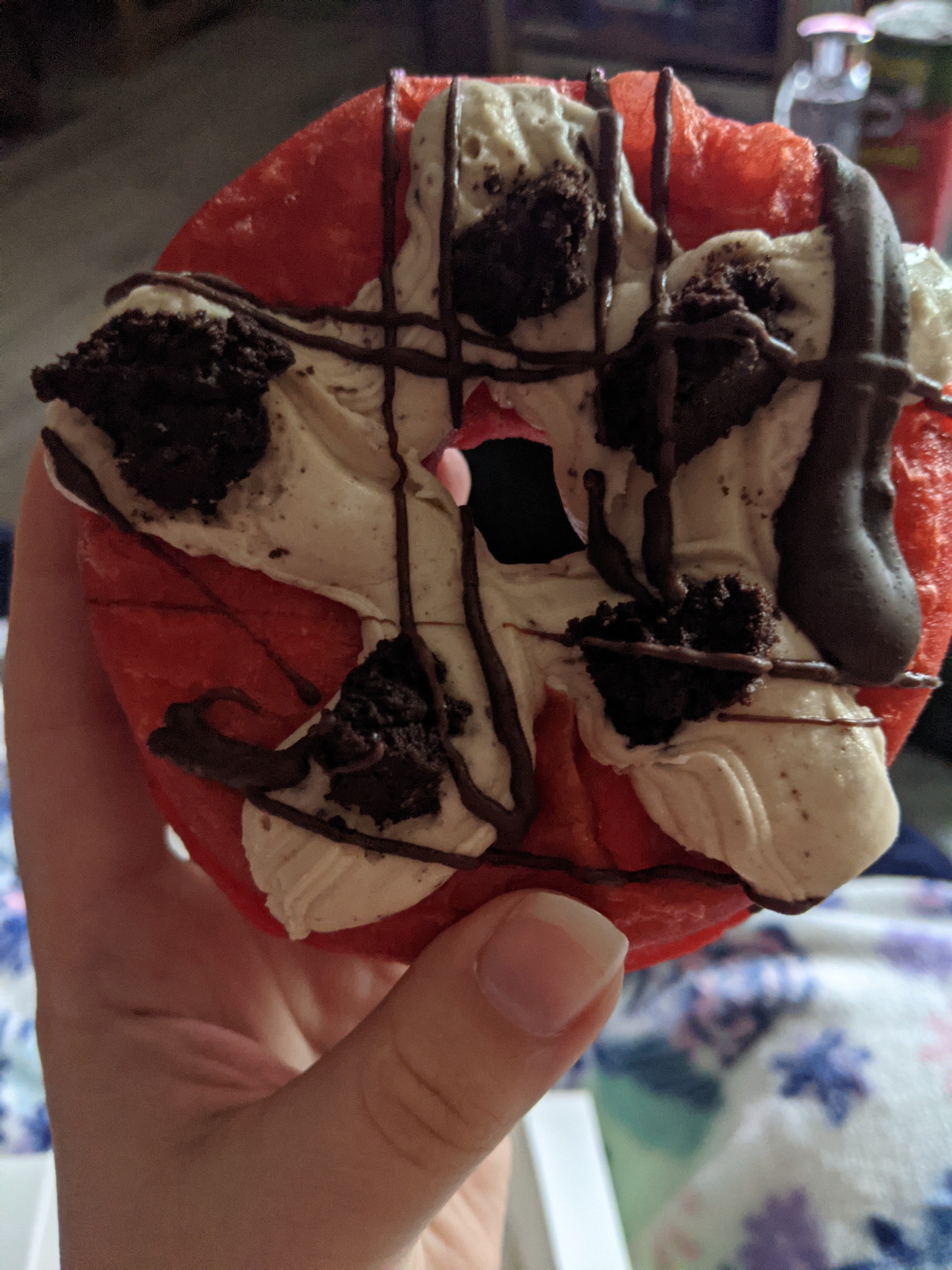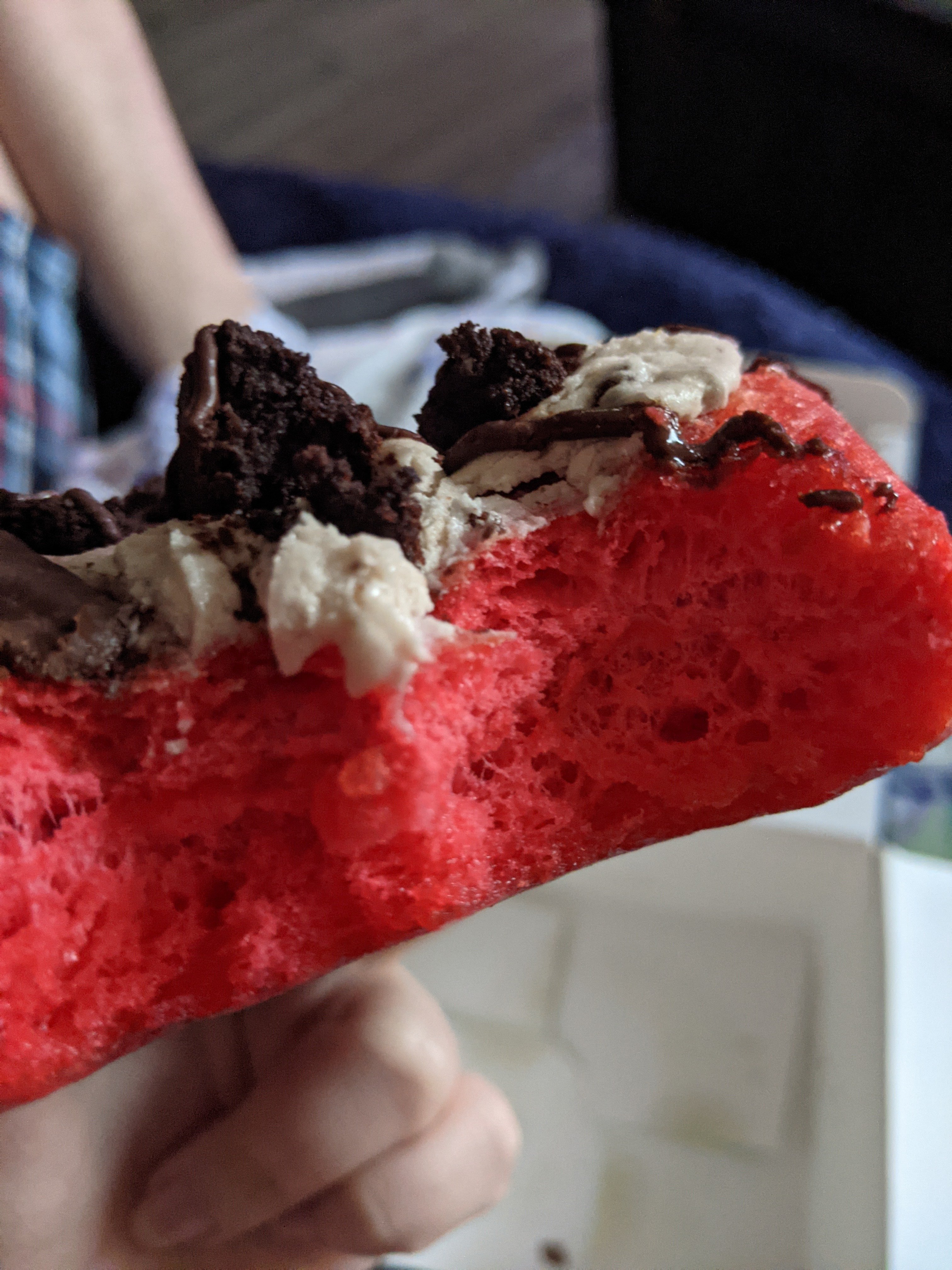 I decided to try the Liam Hemsowrthy doughnut. And yes, all of their doughnuts have humorous names. My personal favourite is the Gordon Jamsey. But I decided to try the Liam for something new. It is a red velvet doughnut with cookies and creams icing and cookie chunks on top of it.
