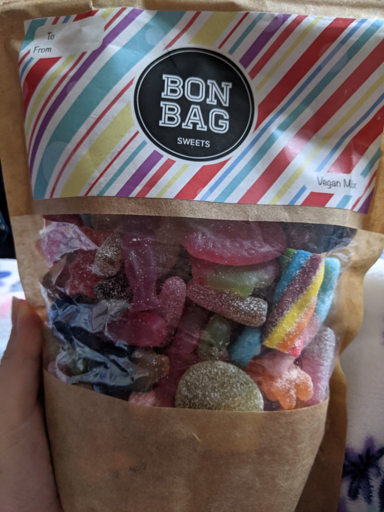 It was my partners birthday in June and one of his lovely colleagues gifted him this huge bag of vegan sweets. So naturally I had to try at least SOME of them.