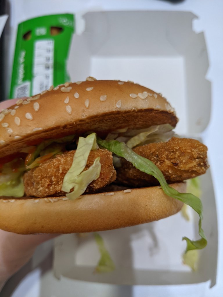 The bun is very dry so it does need sauces to stop the whole thing collapsing as you bite it. The vegan burger does come as default with mayo (not even vegan mayo) but you can easily change it for ketchup. It also comes with a few leaves of lettuce, but other than that it is pretty plain. Again, I don’t expect ground breaking meals from McDonald’s but….they haven’t even tried with this! At least make the veggie fingers into an actual patty.