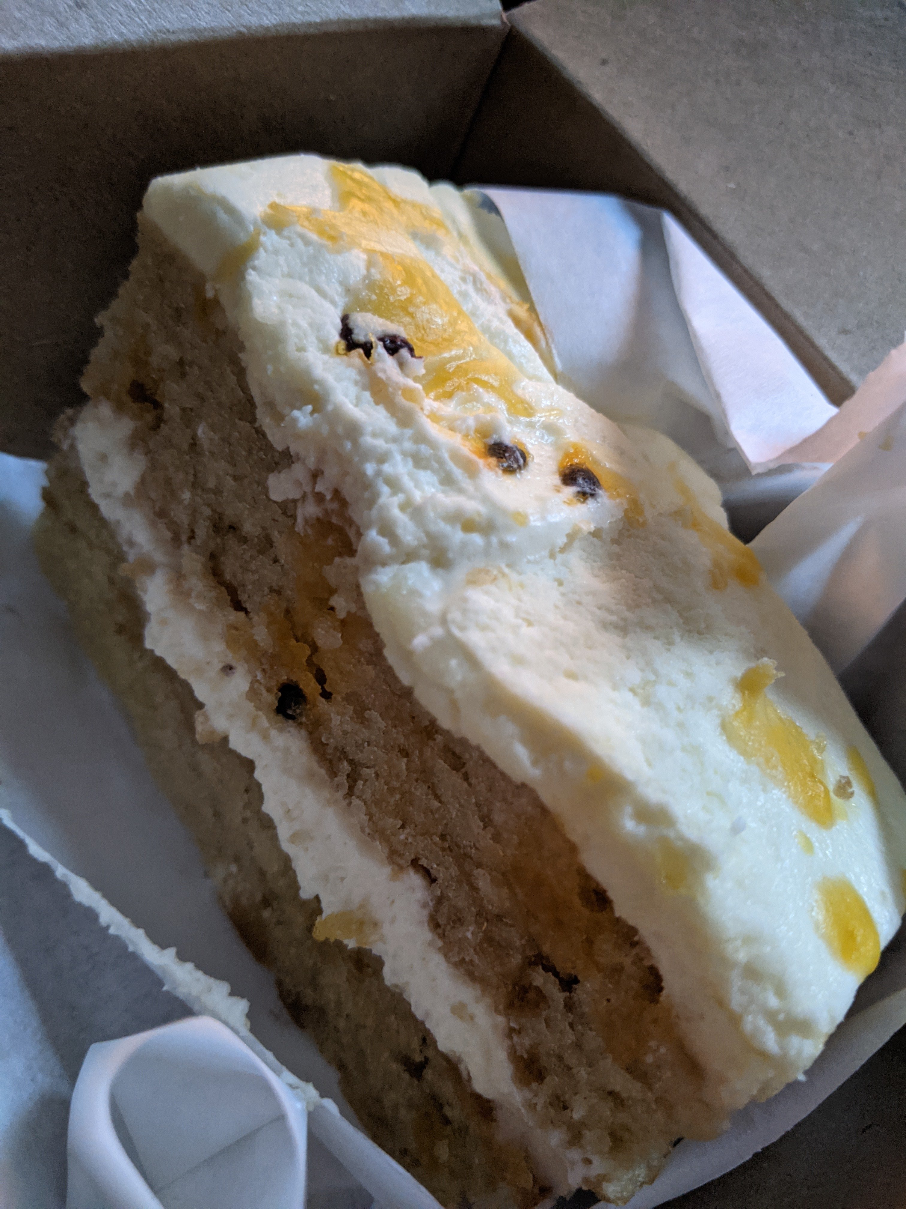 The selection was huge! They had brownies of various flavours (oreo and biscoff for starters), various cupcakes and about 4 or 5 different tray bake cakes to choose from. I think I spent about 20 minutes just trying to decide what to go for. I decided to try their passion fruit cake, mainly because I have never seen a fruit cake on sale anywhere before.