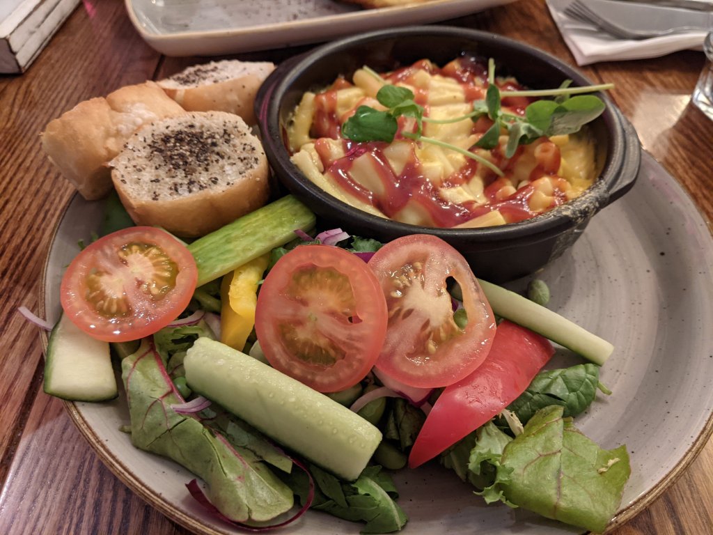 They do have a few vegan options (nothing amazing but there are choices) but I decided to try the vegan mac’n’cheeze. As you can see, the portion was huge! It came with the side salad and ‘bread rocks’ which were just very very big croutons. I don’t know how I was meant to eat these because they were literally rock hard. When I did manage to bite down, the rocks did taste quite nice, but I also fear I chipped a tooth so….maybe not again?