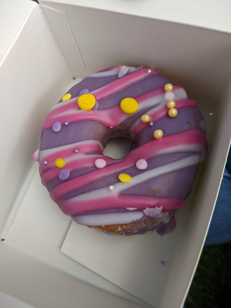 This was actually very nice indeed. It tasted like parma violets! For those who do not live in England and have therefore never experienced a parma violet, they are little sugar disc candies that taste like…well…violet. It sounds odd when I type it, but trust me they are just refreshing and sweet without being super sugary or over the top. It was also nice to have a doughnut time that didn’t make me feel sick after a few bites. I think I could have actually eaten this whole doughnut myself, as it wasn’t overpowering and was just a lovely little springtime treat. Compared to some of the others on sale it also appeared to be the lightest and most understated, which is just what I wanted.