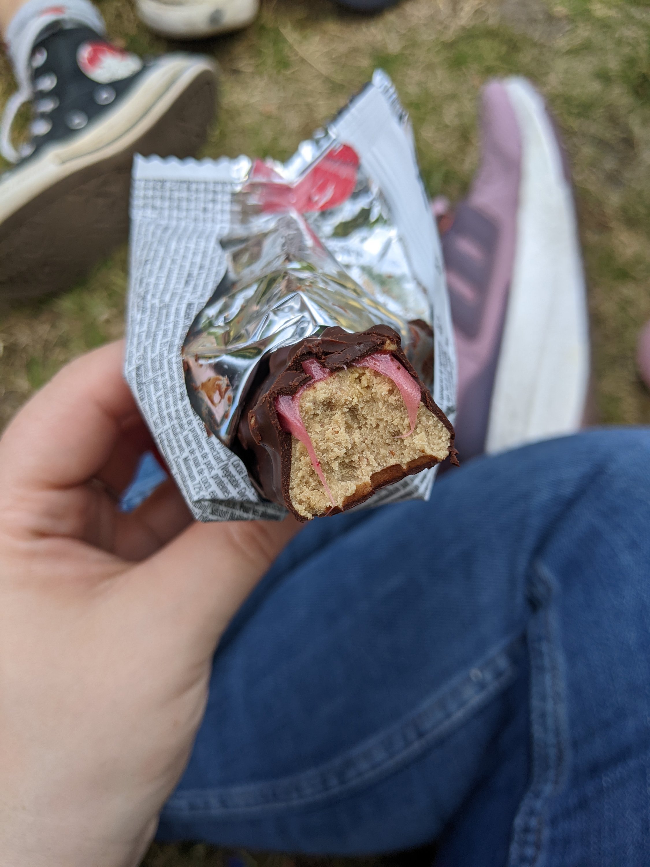 Now right off the bat this bar isn’t too bad. Does it taste like peanut butter and jelly? No, not really. But it doesn’t taste bad either. It was definitely more savoury than you’d expect a bar to be but I would not have been able to tell the flavour had I not already known it. It didn’t really even taste of peanuts, although it did have that odd texture that you usually get with peanut-flavoured things. The almost grainy texture? That’s the one I mean – like peanut paste more than actual peanuts. In all honesty it tasted more like a plain protein shake…like maybe a very subtle vanilla flavour?