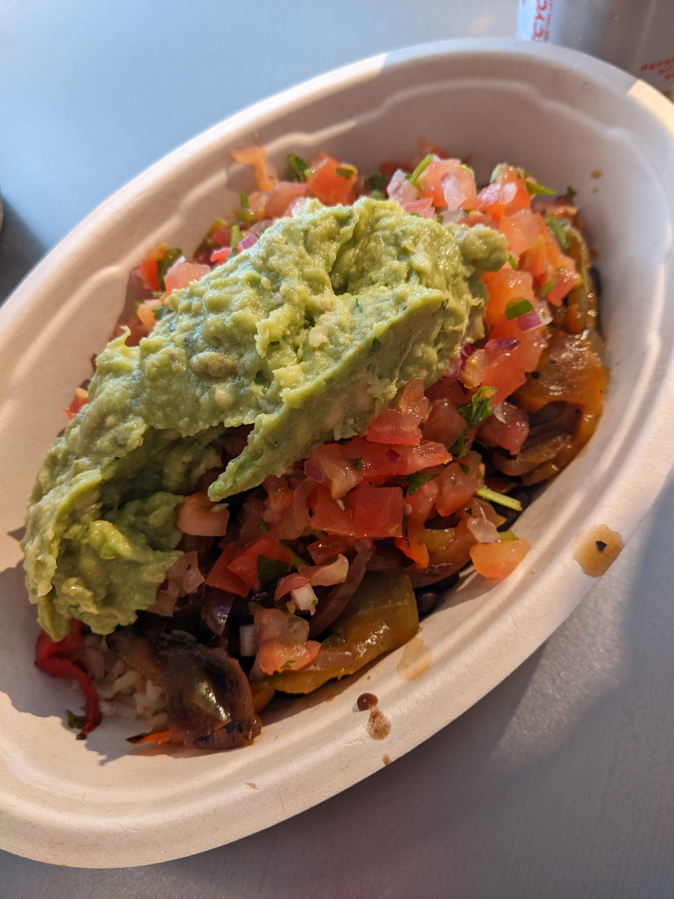 I was a little disappointed that they didn’t have the vegan protein option available (the sofritas option) but they had the basic veggie option so I gave it my best shot. I went for the brown rice, black beans and vegetables which therefore came with free guacamole. I had it in the bowl version, rather than the burrito version, as I find burritos to just be too much for me and I always feel bad for not finishing them. That being said the bowl was very generously filled so I’m not sure if it really makes a difference.