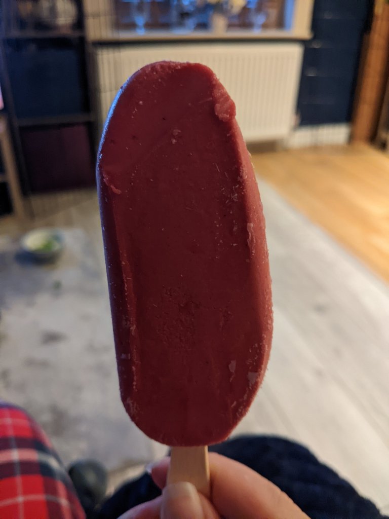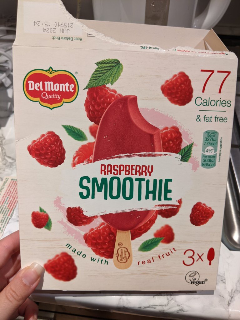 As the box suggest, these are raspberry smoothie ice lollies. As such they have a smoothie texture, in that they are almost like ice cream rather than the hard ice of ice lollies. Plus, while calories are absolutely not important, each lolly is only 77 calories which is WAY less than most ice cream options out there. So these have been great at helping us cool down in the evenings without us feeling like we are consuming more than we need to.