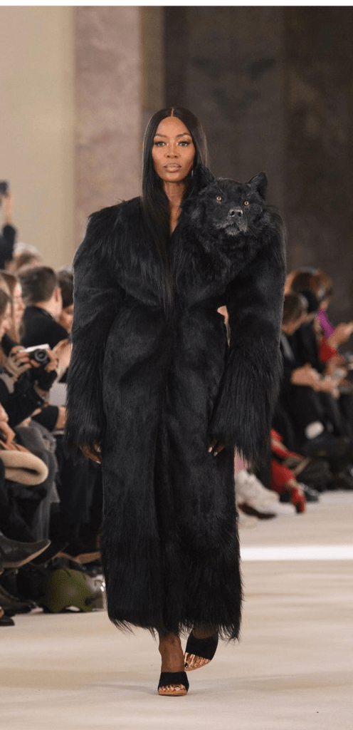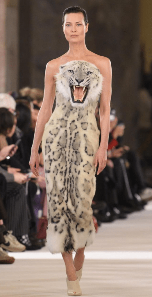 You have a lion, a wolf and a snow leopard. Two of these animals are endangered species. All have been hunted for their fur. So what does it say for a large fashion designer to create outfits based on the fur of these animals? I have seen some commentators argue that it doesn’t glorify trophy hunting, but…what else could it possibly be trying to say?? Why use these animals at all then if the designer is not trying to make the animal head the main focal point of the entire outfit?