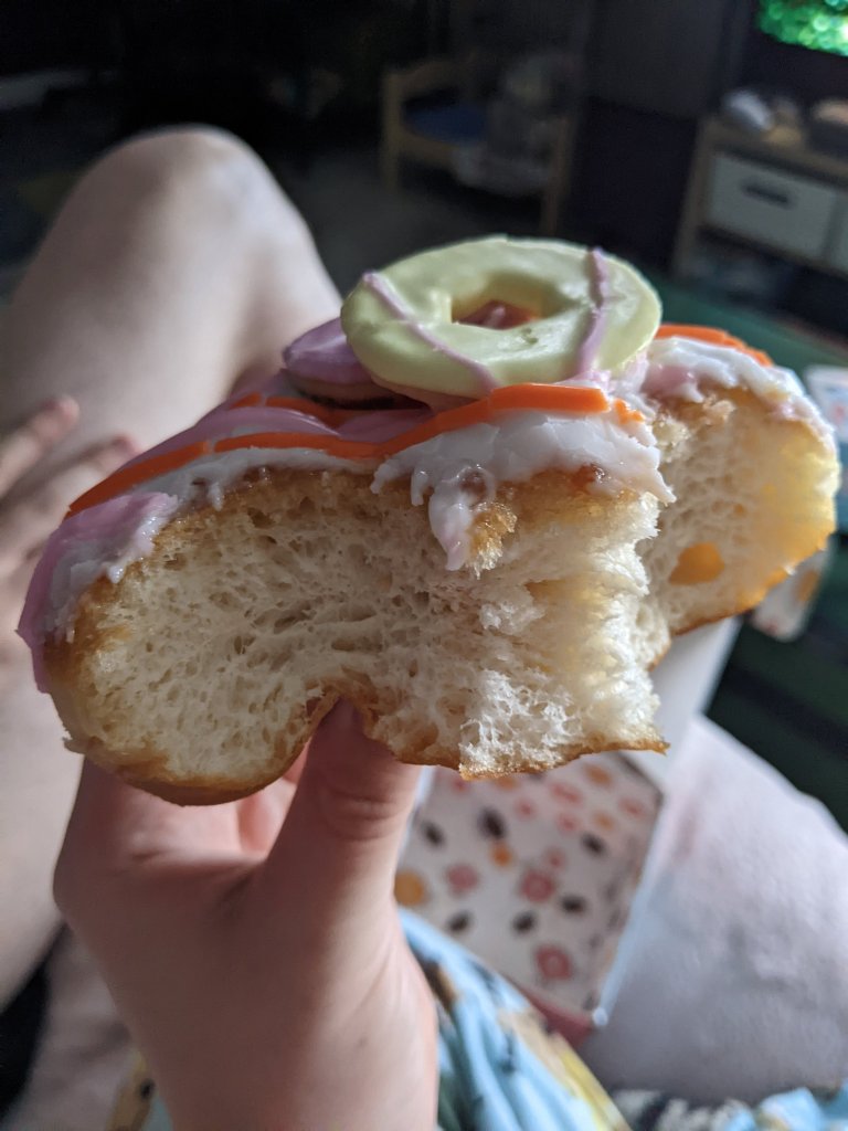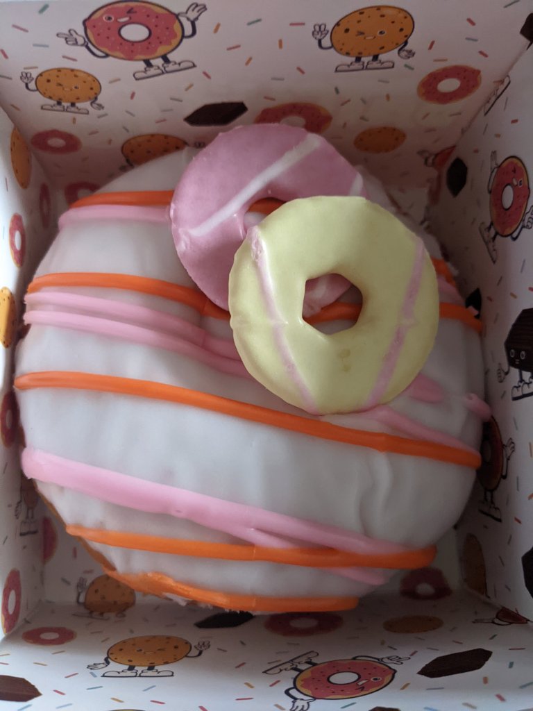 This doughnut however is no where near as sweet as it looks, which I actually much prefer. Doughnut Time, whilst their doughnuts are amazing, genuinely can give you sugar shock their doughnuts are so sugary. Whereas the Batch’d doughnuts are far less sweet, which can be quite a shock when you first look at them. The icing is sweet as you would expect from just plain icing sugar, but it isn’t so sugary that your teeth hurt. I feel like they don’t add sugar to their icing. The actual doughnut is also very cakey, in that it is very light and fluffy and again not as dense as you would expect given the size of it. The very fluffy doughnut plus the icing does balance out to be a nice sweet treat that doesn’t overpower you with sugar in anyway. The downside is that it doesn’t really taste of anything, other than a doughnut with icing. The party rings are a nice touch, but the doughnut does not taste anything like a party ring. I feel the rings were just for decoration rather than as an actual flavour profile.