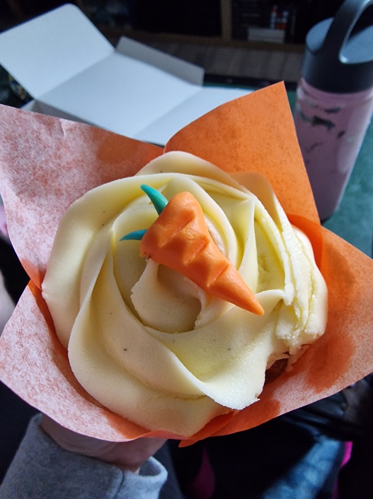 As with the raspberry and white chocolate cupcake before, it is slightly crumbly. Not in a bad way though since all food is crumbly in some way, but just as a small warning to have a napkin or a plate underneath you when you do eat this. Again, not even listing this as a negative because I think every single piece of food causes crumbs. Just as a small heads up because I did not have anything to catch the crumbs with and it made cleaning up later slightly more of a pain. especially when I have a very curious bunny in my house who would probably try and eat some of this cupcake even though she doesn’t like carrots. Or cake.