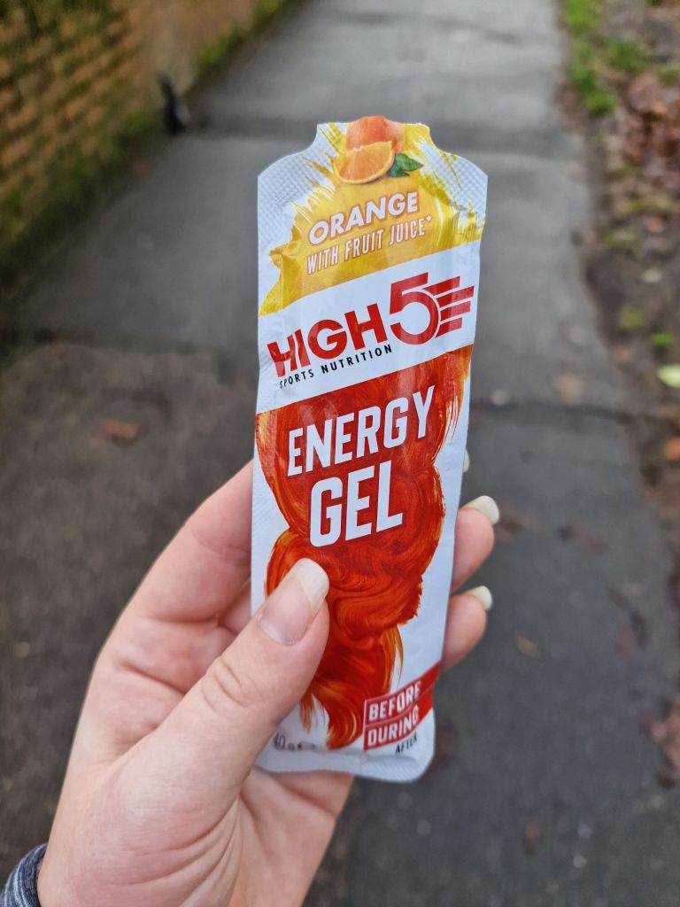 Now this pack isn’t very big (40g according to the front) which actually worked well as I could finish the whole packet in about 3 or 4 mouthfuls. Others I have tried have been around 70g and took me about half a km just to get through it. The gel did actually taste of orange too which was surprising. It did give me a momentary boost to my mood (it’s currently very dark and very rainy here in England so my training runs are a test in mental endurance more than my physical endurance) and also woke me up a bit with the tang of it.