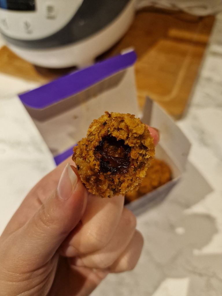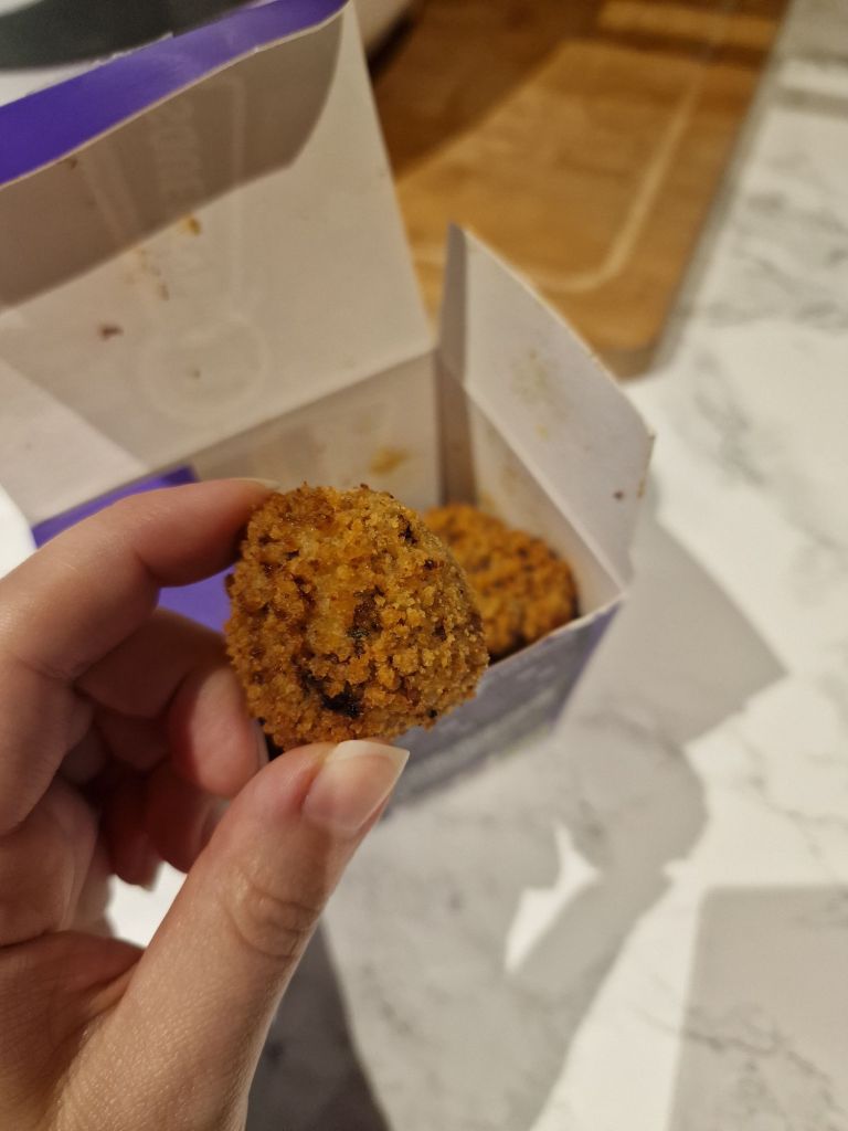 Now I will preface this with the fact that I stopped eating duck when I was about 7, so my memory of what it tastes like is probably very flaky. So just keep that in mind. With that said though, I do not think that these bites are necessarily very ‘duck like’ in flavour nor texture. They are balls coated in bread crumbs, with the hoisin sauce in the middle. I would say that the hoisin is quite an overpowering taste so if you like the taste of hoisin then you’ll probably love these. There isn’t much taste otherwise. The texture is pleasant, in that it has a slight toughness to it as you would expect with a meat-like product, but only so far as it helps the ball hold its structure: It doesn’t crumble as soon as you bite into it, but it also isn’t super tough to bite into. Now I do have these cold, but the box does state that you can warm them up. I am therefore not sure if the texture may change slightly if the product is warmed up first. If anyone does try them hot, let me know what you think!