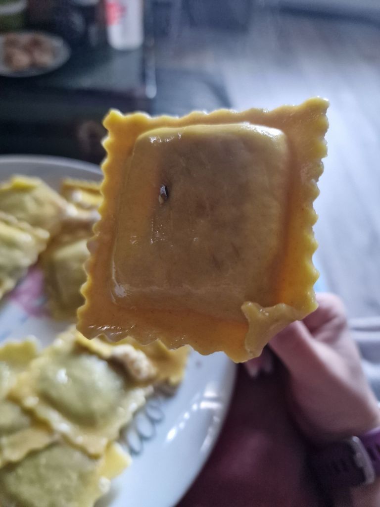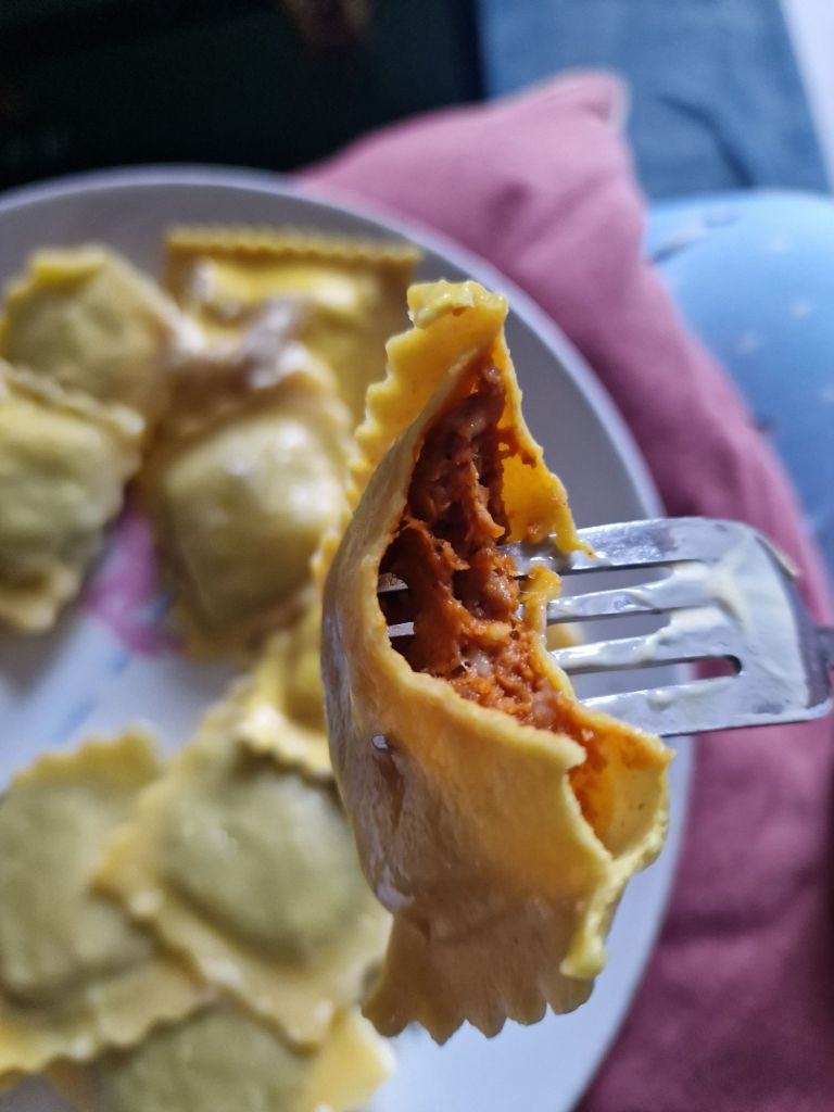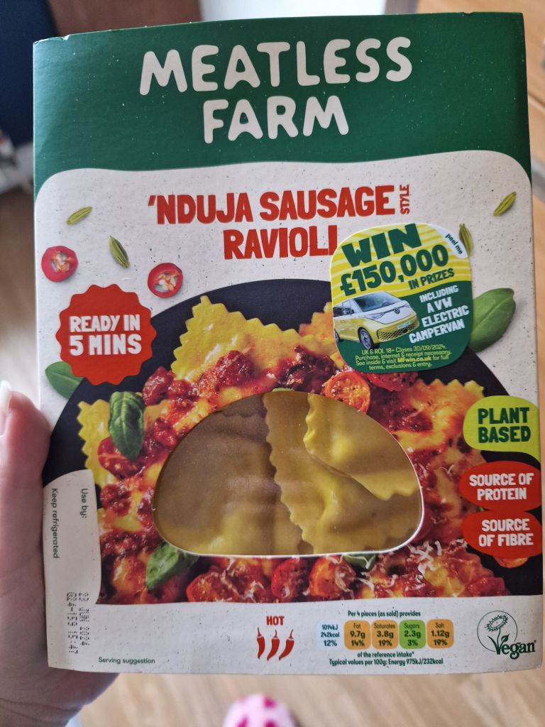 I always find Meatless Farm products to be a sage product to buy. The food isn’t ground breaking but it is always tasty and affordable. So I was excited to finally try their nduja sausage ravioli. Their other offering, the Meatless farm beef, red wine and porcini mushroom girasole is one of my staple quick meals so I was optimistic for this.