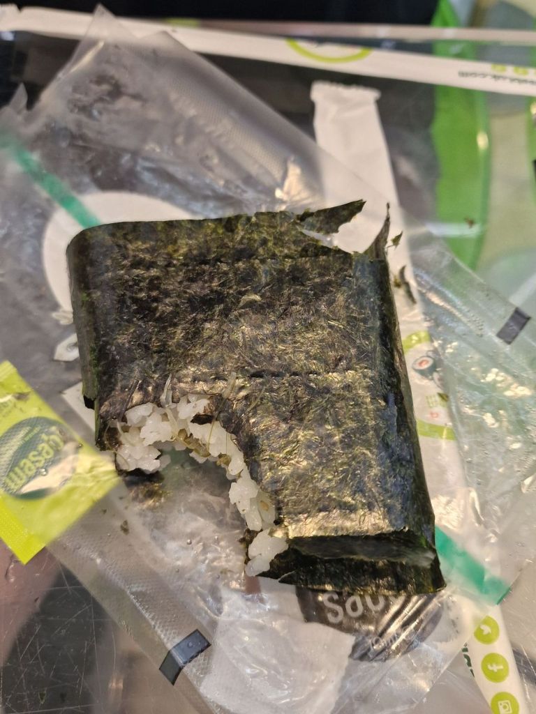 This one was a seaweed salad, which appeared to be just…more seaweed. I did enjoy it, it was very light. The rice was soft and fluffy, as expected, and the seaweed was very light and fresh. I would say it tasted similar to cucumber, but just ever so slightly more salty. If anything I was expecting it to be a lot saltier than it was. Not necessarily a bad thing, just something to take note of. It is definitely a savoury meal. I believe that this is meant to be more of a snack than an actual lunch, but I did find that it was the perfect size for lunch when coupled with the sushi. It was very satisfactory. I have to admit it doesn’t do anything special for me, but I would be intrigued to find out what the sweet versions are like in comparison. If anyone knows where to find this, please let me know!