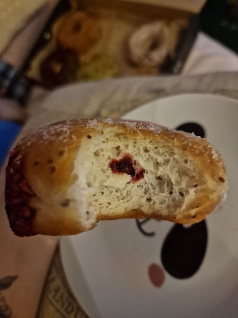 The doughnut is the usual sour dough, which is light, fluffy and doesn’t have much of a sweet taste to it. The freeze dried raspberries on the side were very sharp and tart, and were a lovely flavour compared to the more plain taste of the sour dough. Unfortunately I do wish that they had decided to go for these freeze dried strawberries around the whole doughnut, or maybe all across the top? Having them just in this one little section where the jam filling had been added just looked a bit odd to me. The raspberry jam filing was sweet and silky, but there isn’t really much more to say about this. This is easily one of the better jam doughnuts I have ever had, but in comparison to the other flavours that Crosstown offer, this seems very plain in comparison.