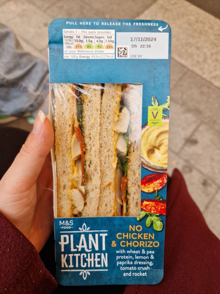 M&S is one of the more pricier places in the UK. It is meant to be more ‘premium’ foods than other supermarkets, but I do admit that I don’t think the Plant Kitchen range does anything different to any other vegan range at a supermarket. This sandwich cost me £3.50, although this cost may vary depending on your local store (I think the prices are also different if you buy from Ocado too). That being said, £3 for a sandwich does seem to be the norm these days, which seems like a whole different issue. I think in a pinch, this is a fine option, but it is so easy to see how buying one every day for work would get very expensive very quickly.