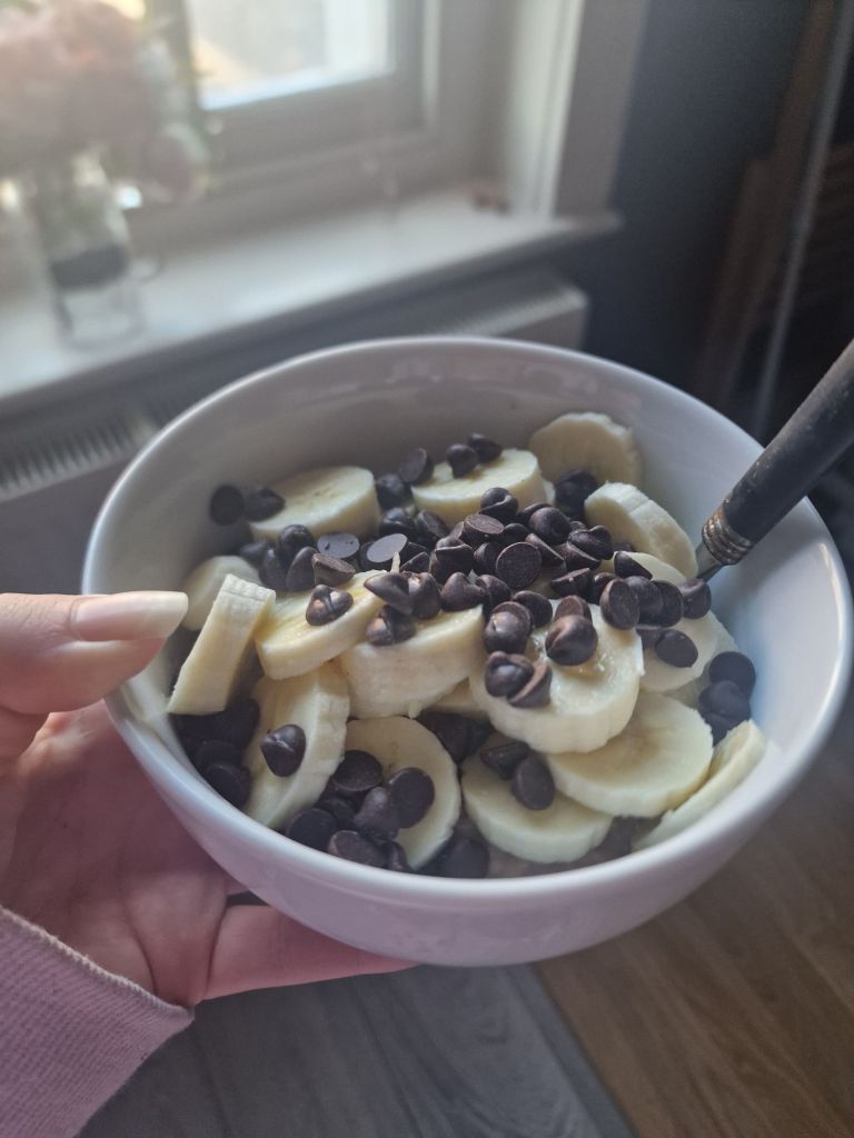 The porridge takes about 3 minutes to cook. I would recommend stirring it as it is cooking to ensure that it all cooks to the same consistency and to make sure there are no odd clumps in the final mixture. Once it is cooked and at your desired consistency, chop up the banana, sprinkle over the chocolate chips, and you are good to go!