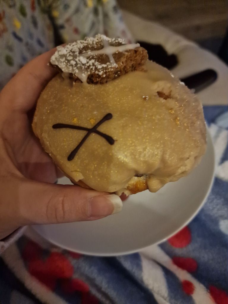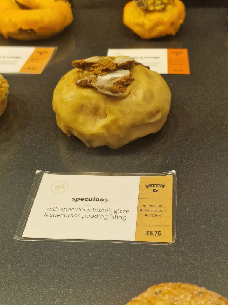 This one was surprising though. It is a speculoos doughnut, which is essentially Biscoff. I love Biscoff but it can get very sickly, very quickly, so I was a little bit concerned about that. But this is not actually Biscoff. The glaze on top I would compare more to gingerbread, in that it had quite a hit of spice with a very subtle sweetness to it. The inside though was the real shock as it was almost fruity: it tasted very light and fresh with a very subtle spice to it, again very similar to gingerbread. It was absolutely delicious and was far lighter than I was expecting it to be. Yes, it is a very generous size, and yes I did share it with my husband, but I definitely could have eaten this whole thing by myself and not felt sick. The dough is the lovely sourdough base they use for all of their doughnuts, which is light and fluffy, and isn’t sweet. This doughnut was such a pleasant surprise and it did make me feel very festive with its lovely blend of spices.