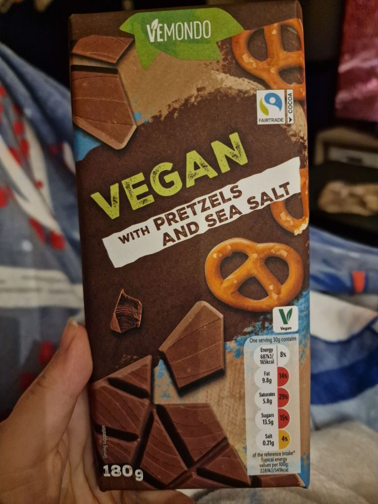 It is very tasty chocolate. It is a very thick slab, so I would not recommend putting this in the fridge unless you want to chip a tooth. The milk chocolate is very creamy and has that very subtle hazelnut taste to it (as it is made with hazelnut milk) but I wouldn’t say it is a noticeable taste. The pretzels add a very satisfying and tasty crunch to the chocolate, and I think the best way to describe the texture is that it is like a thick KitKat bar. The sea salt I am pleased to say is also sprinkled throughout, so whilst some bites may be saltier than others, the salt is not so strong that it overpowers the sweetness of the chocolate. Just every so often you may get a little kick of salt where you bite into a salt granule, but otherwise the flavours all complement each other really well and make for a very tasty and surprisingly moreish chocolate bar.