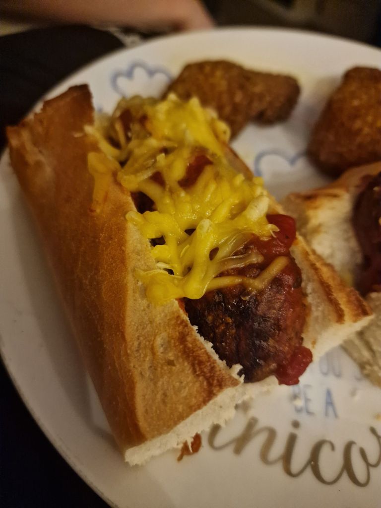 - Place your meatballs into the baguette cuts, add any left over sauce (if you want to) and if you have cheese, place this on top.