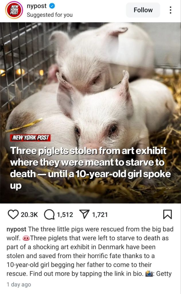 According to news reports I have read, the exhibit involved starving three piglets on display to protest agricultural pig farming. The artist, Marco Evaristti, created the exhibit “And Now You Care” was designed to highlight the 28,000 piglets that die daily due to poor breeding conditions in Danish pig farming. As part of the exhibit, the piglets were to be confined in a cage made from shopping carts and were not to be provided with food or water. Visitors of the exhibit were given the option to use a captive bolt gun to end the piglets’ suffering, and Evaristti had also pledged to feed them only if an associated Instagram group manage to reach 22,000 members who were pledging to boycott conventionally farmed pork. Evaristti had stated on his Instagram page that the exhibition “is a confrontation with Denmark’s bloody reality” in slaughterhouses, and that he was urging people to reduce their meat consumption and support agriculture that improves animal welfare.