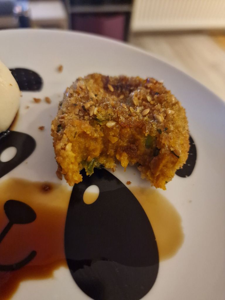 To start with, these are very tasty. The outside is panko crumbs, and one downside to begin with is that the crumb coating is very much crumbly – these were a little messy to eat as the seeds in the panko crumbs fall off very easily. It didn’t affect the taste in anyway, but just a heads up if you did want to try them that they can be a little messy. The outside is otherwise very tasty, and has a wonderful crunch to it. The inside though is soft and creamy, and a perfect pairing for the very crunchy outside. The other warning I would give is that the inside (at least when I tried them) was hot as lava whilst the outside was far cooler to the touch. Again, a little warning to cut the fritters open to let them cool down a bit before just biting into them, otherwise you will be burning your mouth. Like I did. The pumpkin flavouring is very strong and rather sweet, but I found the miso gave it quite a nice little kick of that savoury flavour to help balance it all out.