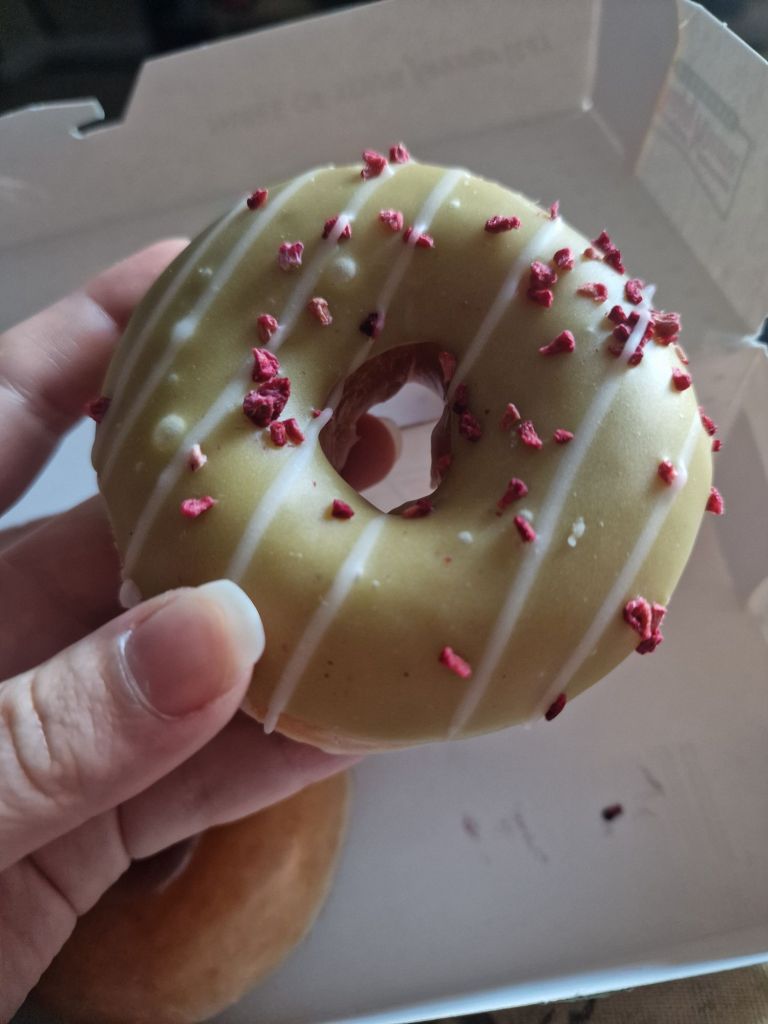 There is very little pistachio flavouring to this. There is a slight savoury flavour to it so the doughnut isn’t as sweet as it usually is, but I would not have been able to say that it was a pistachio flavour. Which is a shame because I do love pistachios! The raspberry flakes were a nice visual addition, but again they didn’t really taste of anything. I had hoped that they might have added a little tartness to the doughnut, and I guess they did, but they are such tiny flakes that the flavour barely registers in comparison to the sweet of the doughnut.