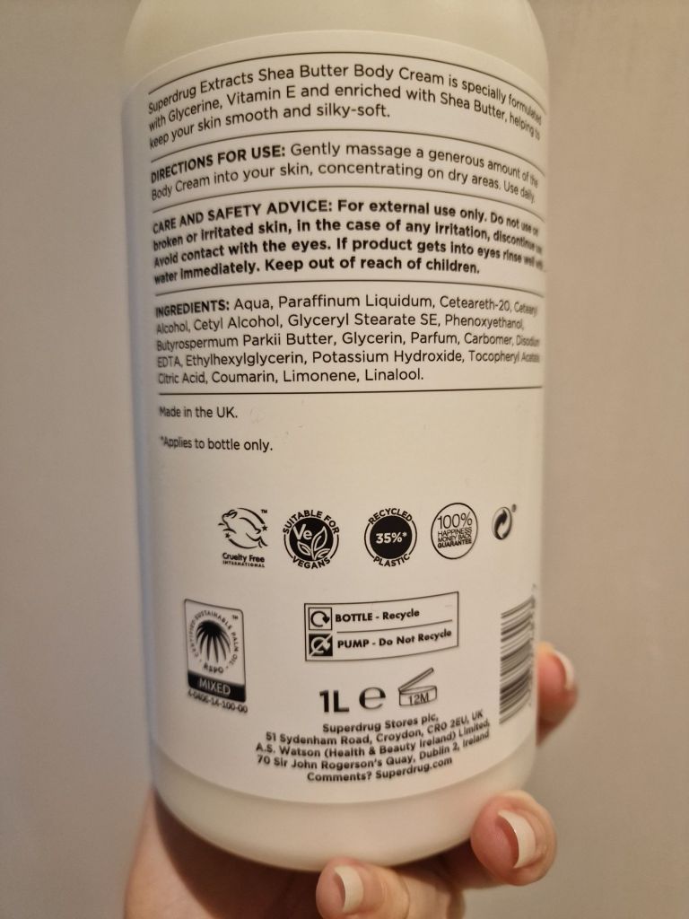 I decided to start quite simple and to test out a few body lotions to find one that I really liked and also worked well with my skin. My skin can get quite dry, especially in winter, so I am ideally looking for a product that is hydrating enough for the winter but is not so heavy a lotion that it weighs me down in summer. Superdrug is my go to shop for affordable and good quality products and all of their own brand products are vegan friendly and cruelty free. As I am still testing out what really works for me, I didn’t want to start with very expensive products and am currently focusing more on what ingredients seem to work best for my skin. Maybe as I narrow this down, I might invest in the more expensive and high end products, but this remains to be seen.