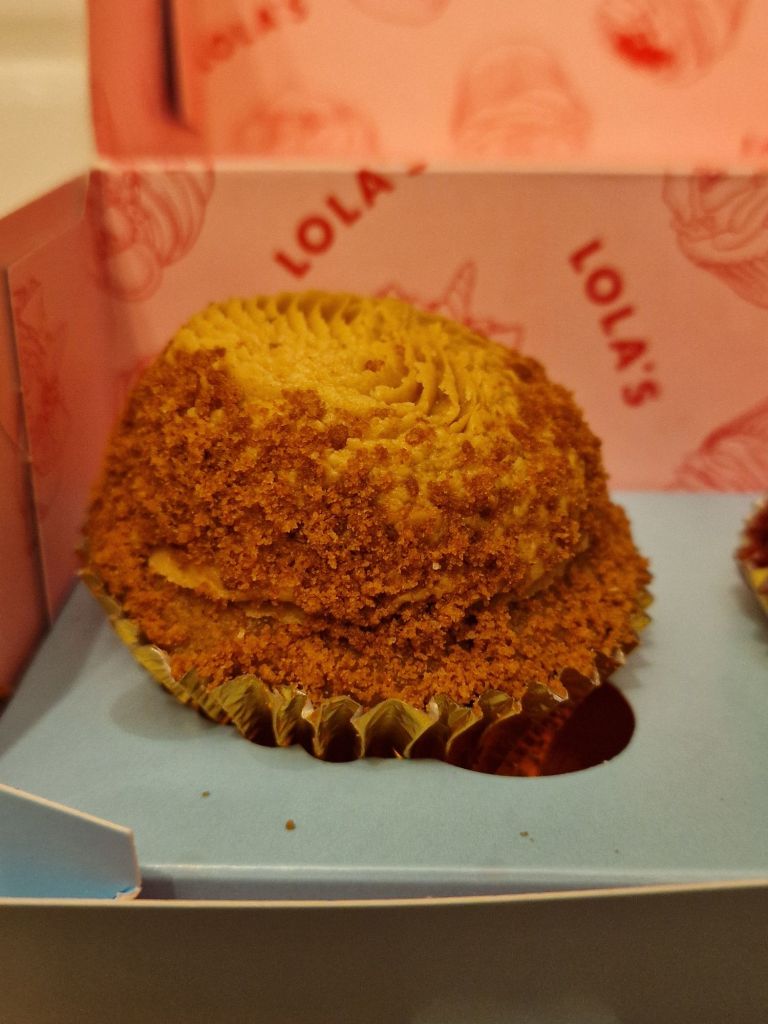 I was very happy to see that it is the latter! Whilst the biscoff flavour is strong, it has been softened a lot by whatever it is Lola’s has used in their recipe. The cupcake itself was moist and fluffy, and there was a small filling of the biscoff spread within the actual cupcake itself. The icing was sweet but not sickly sweet, and I feel this did help to soften the biscoff flavour quite a lot. I get the impression that they used a very small amount of biscoff within the recipe, as the flavour is there within the whole cupcake, but not overpowering or sickly as biscoff so often is. This is very much an example of ‘less is more’ because I truly could have eaten another of these cupcakes after this one, they were that yummy! The cupcake also had a light dusting of biscoff cookie crumbs on top, which also helped to add a nice little crunchy texture to the overall cupcake, and I think it just gave it this lovely little extra.